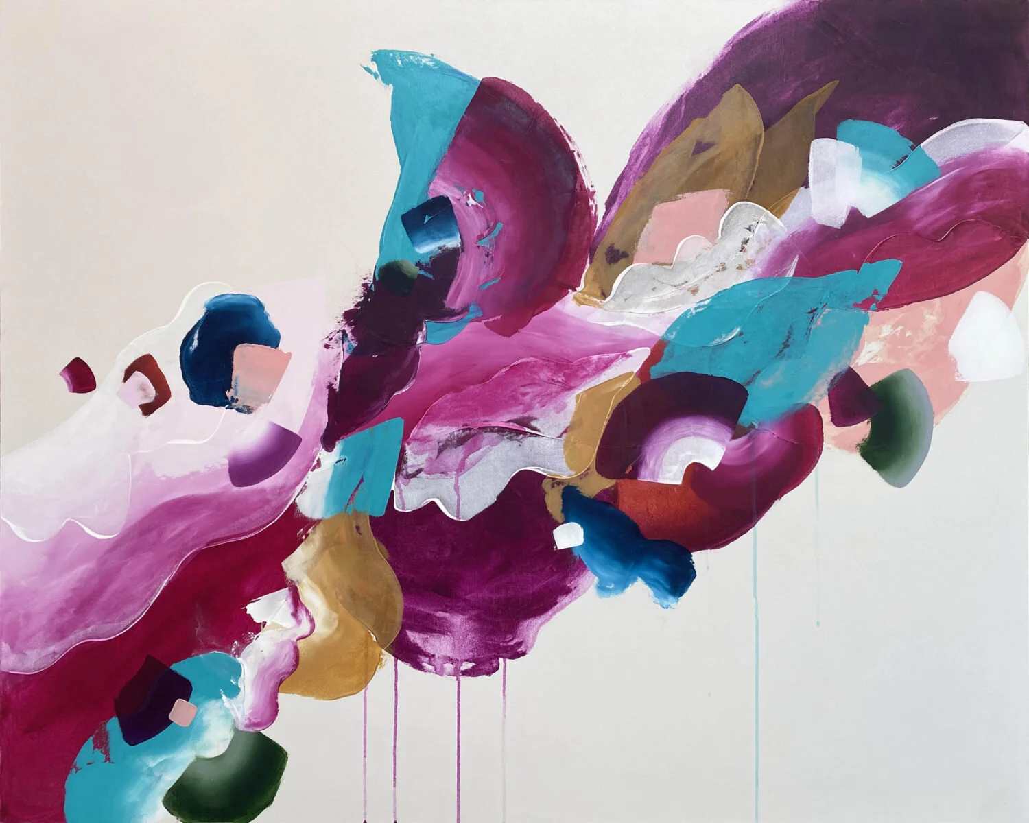 This series is about passion, resilience and freedom. These radiantly colourful pieces embrace the idea of being wholehearted; the moment when you decide to go all or nothing, reaching out to chase the dream. These paintings evolved so naturally, embracing every drip and the blending of paint as the colours overlapped. Like a field of imperfectly beautiful wildflowers.